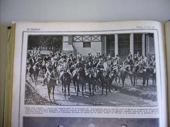 Nuestra foto lleva el siguiente epígrafe: “Caza del zorro”, El Gráfico, n° 47, Buenos Aires, 15 de mayo de 1920, p. 22. Allí vemos un grupo de jinetes y amazonas reunidos en el Club Hípico Argentino después del paseo del 9 de mayo de 1920.
